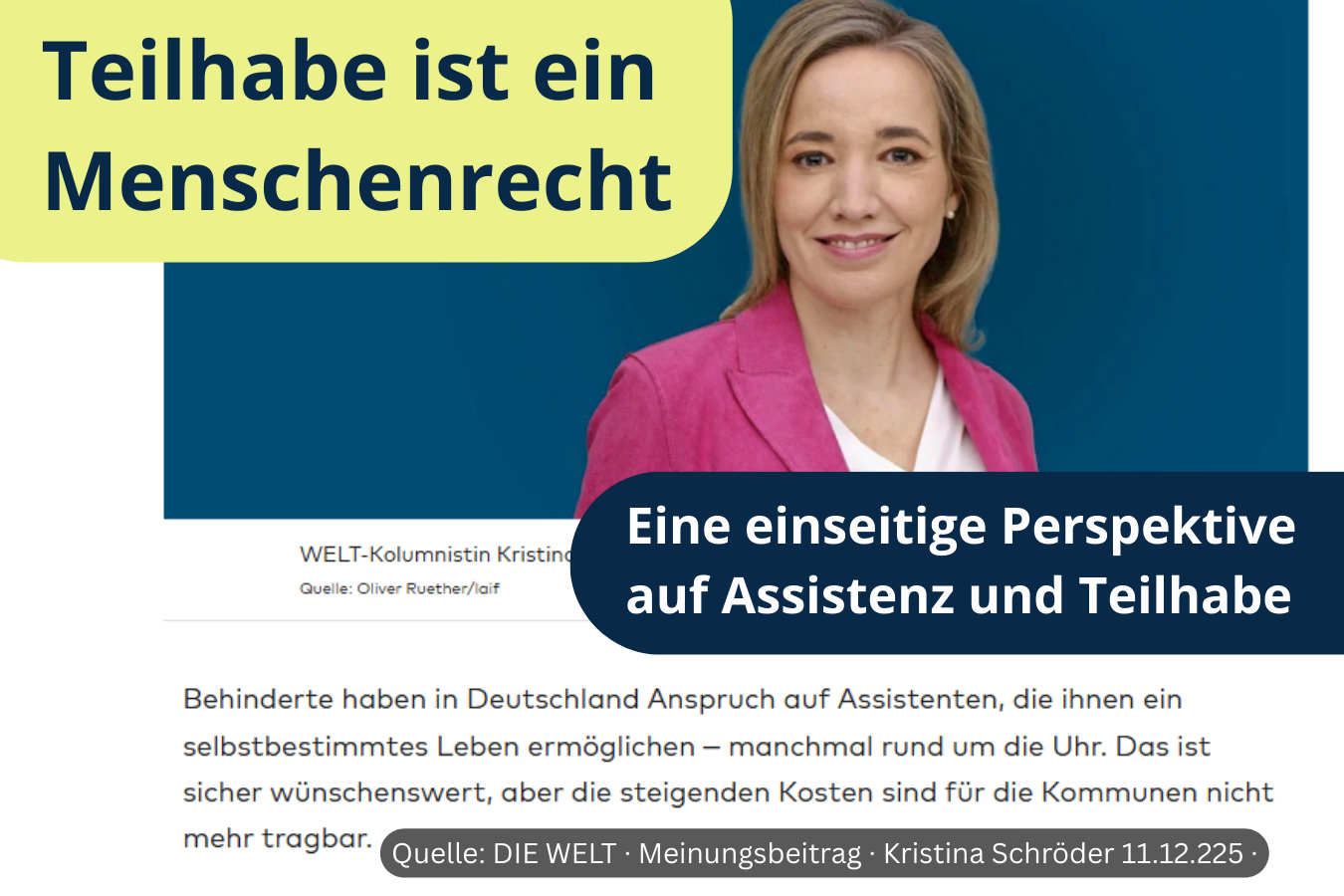 Kristina Schröder fragt in der WELT, „was wir uns künftig nicht mehr leisten können“ – und meint damit unter anderem die Eingliederungshilfe, das Persönliche Budget und Assistenzleistungen für Menschen mit Behinderung. Der Text ist sorgfältig formuliert, empathisch im Ton, aber problematisch in der Sache. Denn er verschiebt die Perspektive: Weg von Rechten, hin zu Kosten. Weg von Systemfragen, hin zu Einzelfällen. Und genau darin liegt das Problem